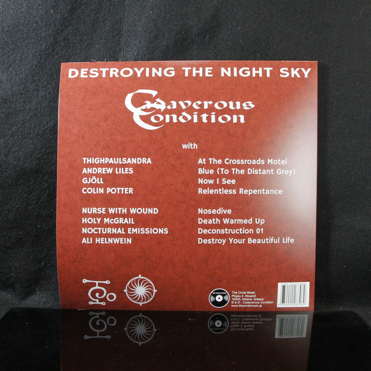 The album starts with a monstrous longtrack by Thighpaulsandra (COIL, HAWKWIND, ex-SPIRITUALIZED, JULIAN COPE etc.) who arranged a plethora of sounds and vocals and weirdness, thematically mixing Cadaverous Condition ideas with his own reminiscences of an old English TV series. GJÖLL from Iceland, featuring Reptilicus personnel, go bass heavy in their soundscapes. As on the original CC song, this track features vocals by Patrick Leagas (Sixth Comm). Nurse With Wound feature here with one of the most extreme, heavy and noisy nightmarish reworks, crushing everything. Members Colin Potter and Andrew Liles (with a track not on the CD version — completely unreleased until now) add their own solo reconstructions, living up to their reputation as sound innovators. Holy McGrail (Slomo, Julian Cope collaborator) channels some drones from beyond the grave. Legendary sound artists Nocturnal Emissions mix several CC tracks into one intense piece. Bittersweet relief (maybe) comes with a cinematic neoclassical version of CC favourite “Destroy Your Life”, done by Ali Helnwein, film score and classical music composer, son of Austrian artist Gottfried Helnwein.