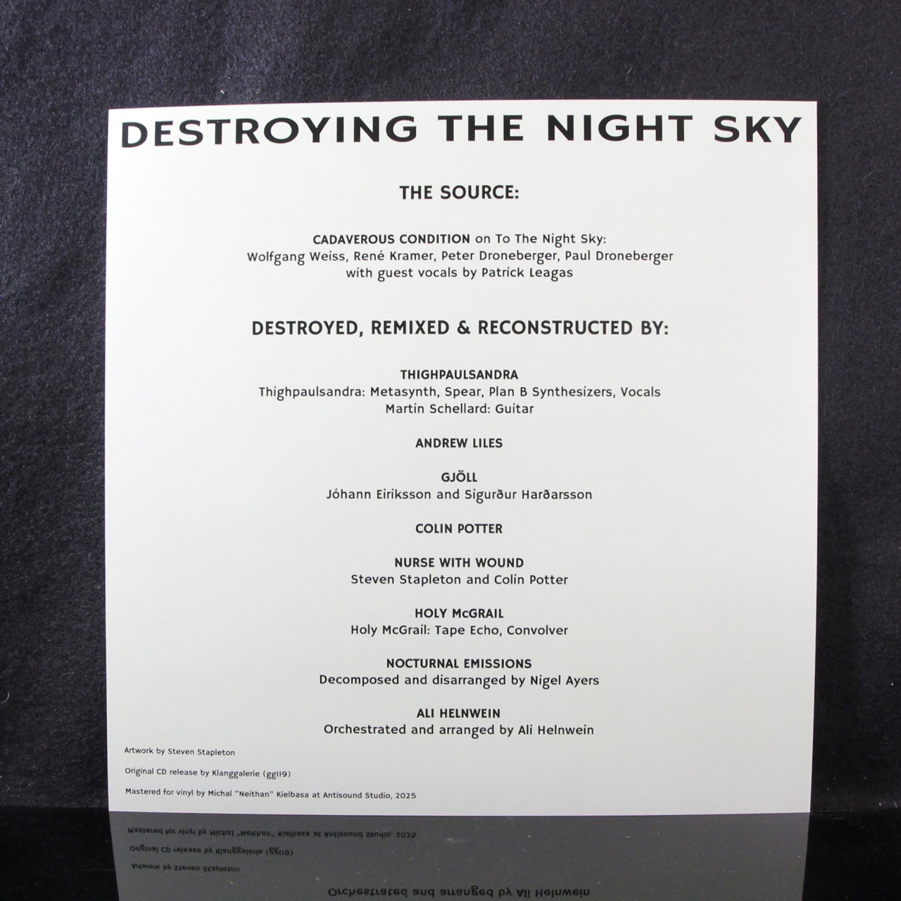 Many years ago, Death Metal band Cadaverous Condition invited a stellar line-up of experimental artists to completely dismember, rearrange and reconstruct songs of their “To The Night Sky” album. The result: “Destroying The Night Sky” – one of the weirdest collaborative albums ever assembled. Extreme Metal, melted and shaped into new ghoulish form — an experimental, surreal nightmare of sounds and outré weirdness, originally released on Klanggalerie Records on CD only.